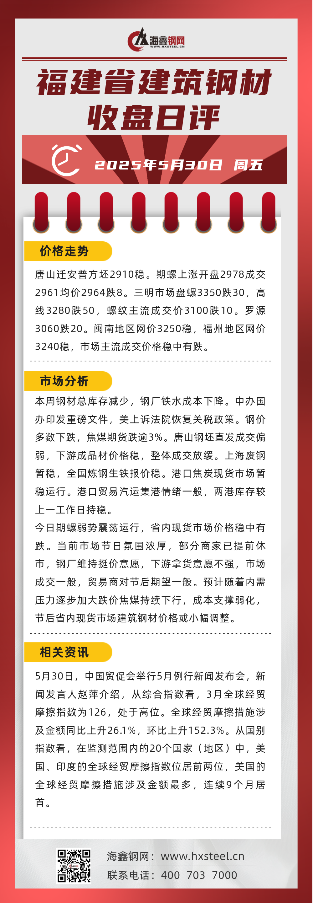 5月30日福建省內(nèi)建筑鋼材收盤日評