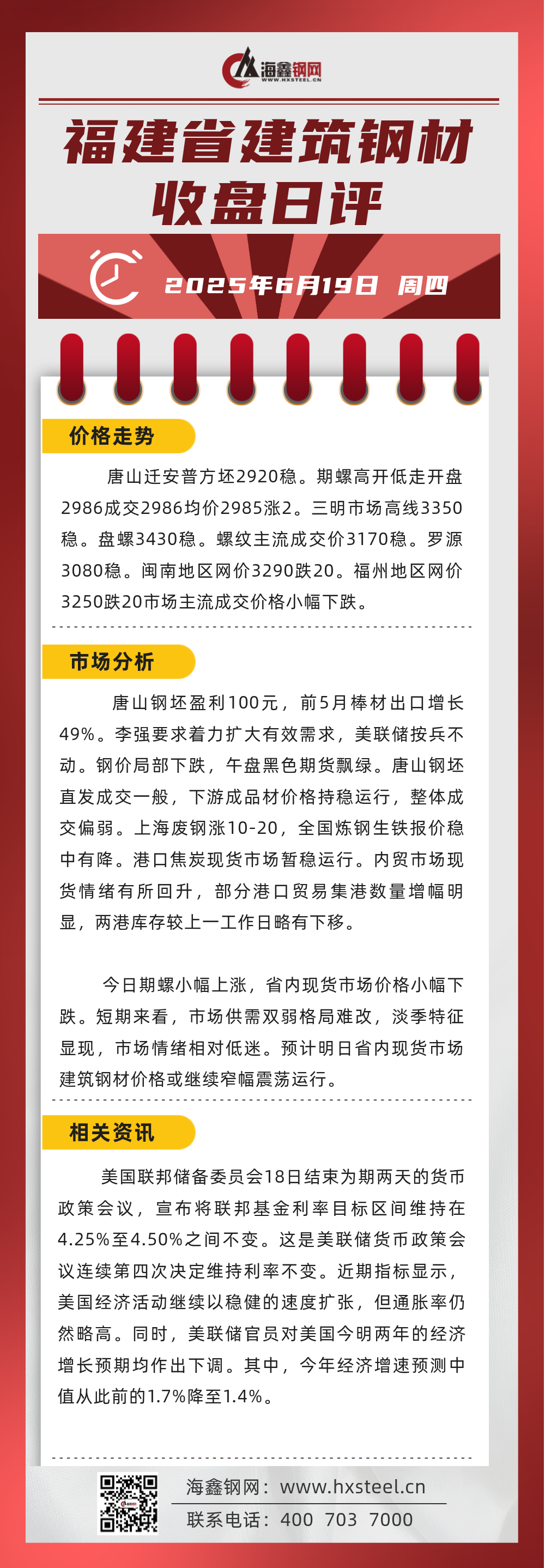 6月19日福建省內建筑鋼材收盤日評