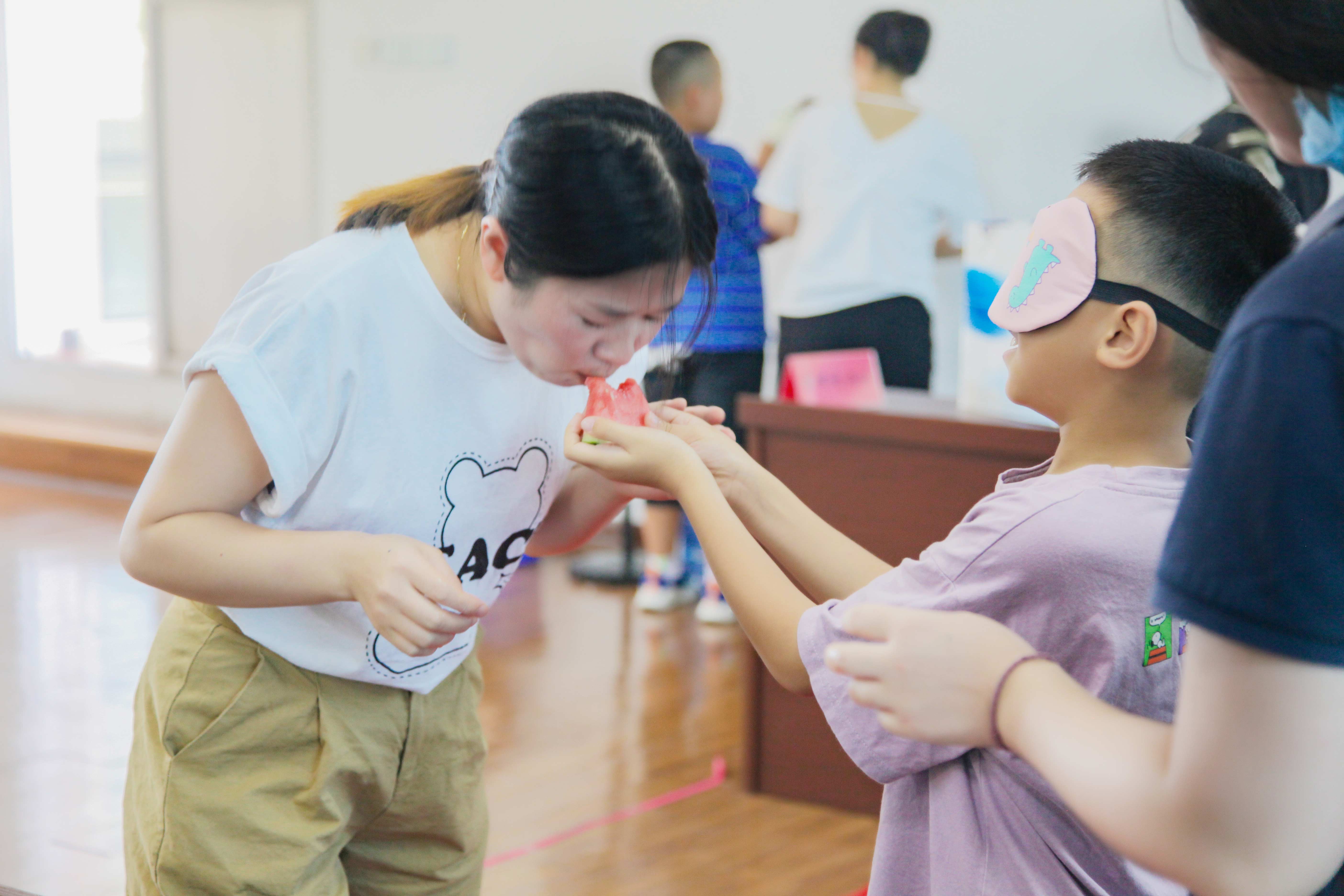 “蒙眼吃西瓜”游戲輕松快樂,孩子們蒙著眼睛,憑感覺尋找父母嘴巴的位置,并喂食西瓜,這項(xiàng)游戲很好地增進(jìn)了親子之間的感情。
